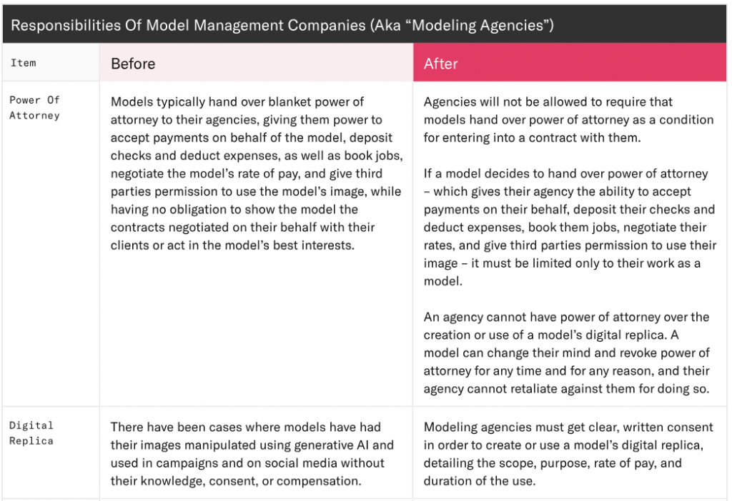 Let us now move to the model industry. A few years ago, I shared a panel with the founder of the Model Alliance (basically a union of models) and kept following their work. Models are usually contractors with very few rights which mean that they need to pursue change through legislation.