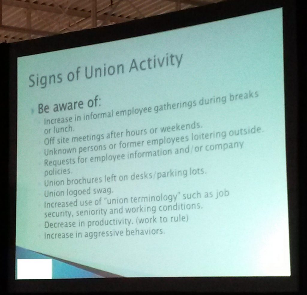 Conversely, many companies will try to reduce the influence of unions. A few years ago, I was at a security conference and trade show in Toronto and one of the sessions was about strategies to combat unionization. The image below shows what you should be looking for.