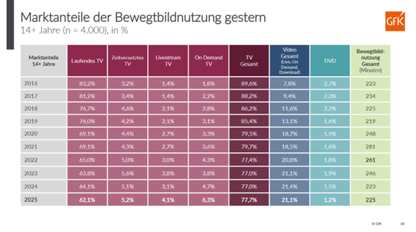 Unbundling: We can observe a similar unbundling of offers with the launch of video-based platforms like YouTube or TikTok. Market shares are going back, but it is quite remarkable that the total view time stayed constant at 225 minutes over the last 10 years. The numbers are from the Austrian Moving Image Study 2025 (Bewegtbildstudie) and – obviously – there are nuances in terms of age groups and formats. However, TV remains a strong format. For the non-German speakers: The illustration shows the share of different formats (linear TV in the first column) over time and the minutes of video consumption per day in the last column.